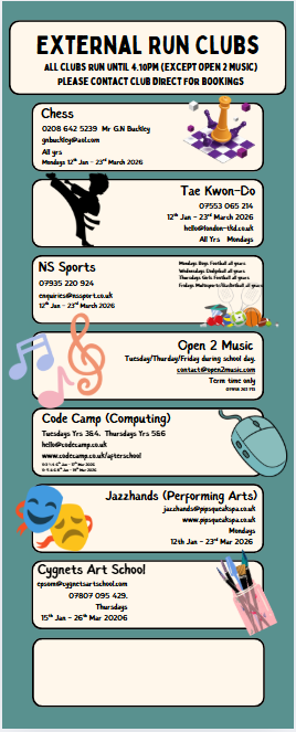 Teacher led clubs will start first week of January - see below for timetable - finish at 4pm and collected from main playground.